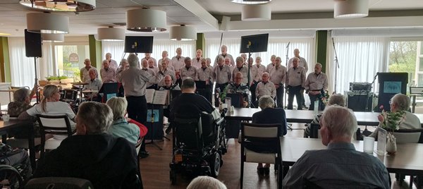 Donderdag 16 april ging ons koor de provinciegrens over naar Assen de hoofdstad van het mooie Drenthe. Hier is het woonzorgcentrum de Vijverhof. Voor zover ik weet (en dat is al sinds 2001) is dit de eerste keer dat wij hier een optreden hadden. Een grote groep en ons combo heeft voor een enthousiast publiek een goed optreden verzorgd met liedjes (in drie blokjes) die de bewoners aanspraken. Voor verzorgingshuizen passen we ons programma aan, zodat er voor de bewoners een vorm van herkenning is. Voor Melle en Freek was dit de eerste keer om solo voor publiek op te treden. Top mannen. Na afloop werden we uitgenodigd om in 2027 weer een middag te verzorgen. De bewoners en verzorgers hebben een mooie middag gehad en wij ook een goed optreden.